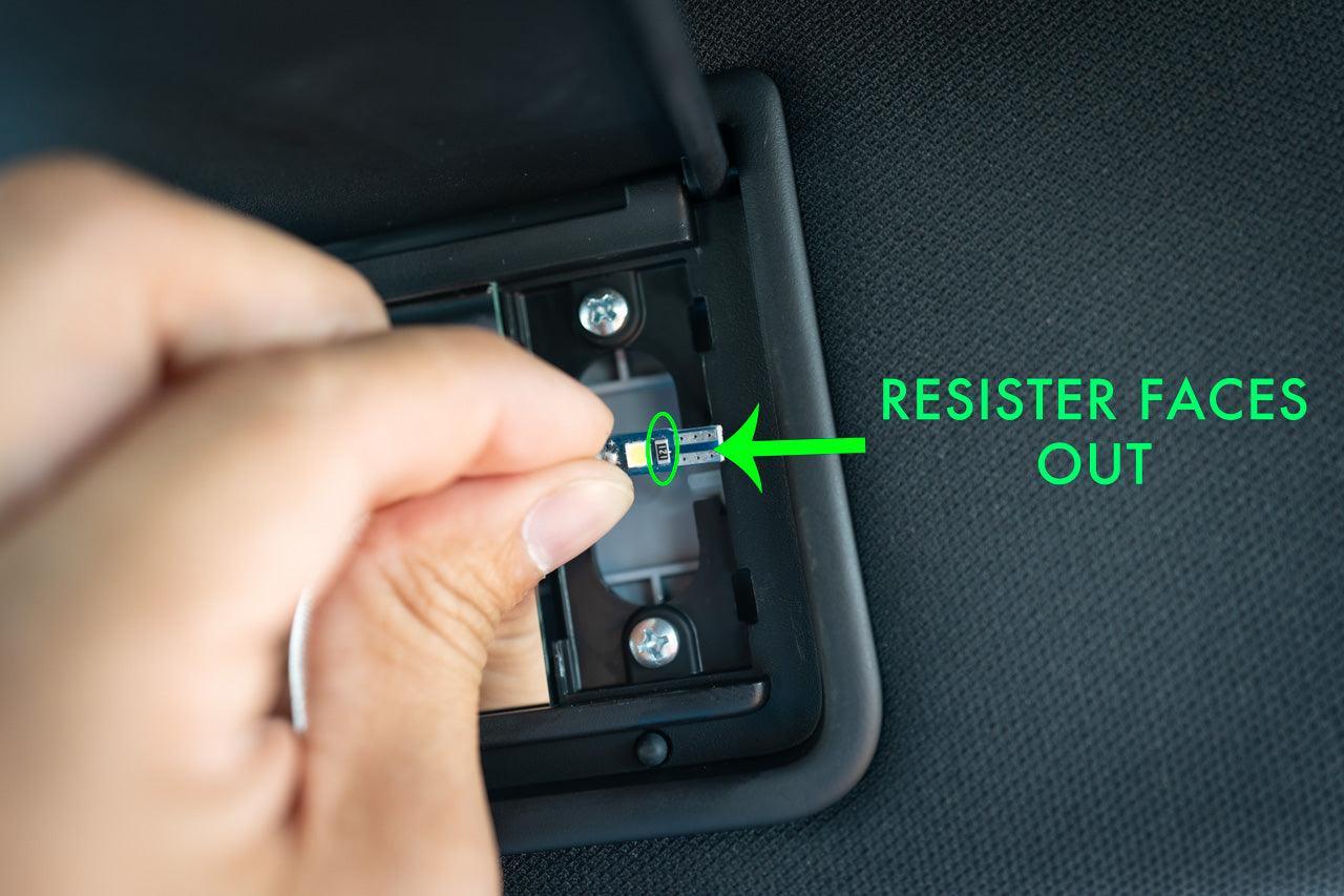 The outer portion of the white cover can be pulled up with your fingers (side opposite the side touching the mirror). Use a small screwdriver and carefully push out the OEM bulb. Replace with our bulb and make sure the resistor faces out. Check out our photos in the main slideshow.Share